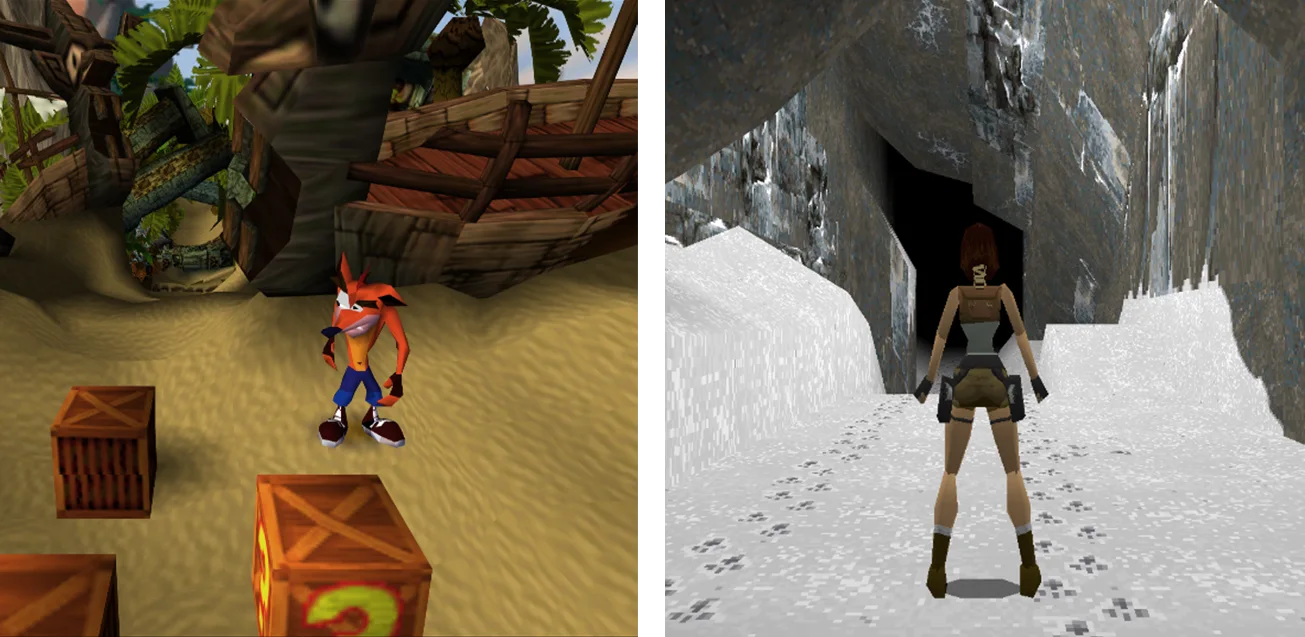 Both scenes run on the original PlayStation. Crash streams level data aggressively, enabling denser textures and more visual variety. Tomb Raider relies on traditional loading.