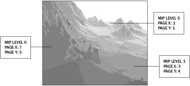 Each shade of gray represents a distinct virtual page. Brighter regions correspond to coarser mip levels.