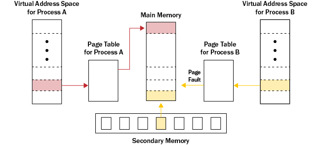 When RAM runs out the operating system can move inactive pages to disk. If a program tries to access a page that is not resident, a page fault occurs: the OS loads the missing page back into memory, updates the page table, and execution resumes. There is a cost to this, but the system is designed to make such faults rare.
