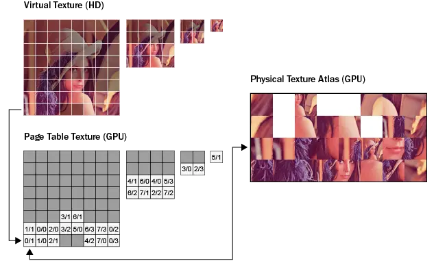 Virtual texturing applies this approach to textures. A massive texture is exposed to the application, but only the pages required for the current view are kept in GPU memory, often just a few megabytes, with residency tracked explicitly through a page table.