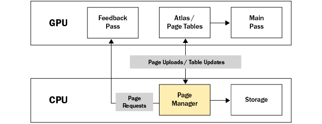 Virtual texturing is not a single shader. It is a system. Multiple components work together across the CPU and GPU to make massive textures appear fully resident while only a small fraction of it actually occupies GPU memory.